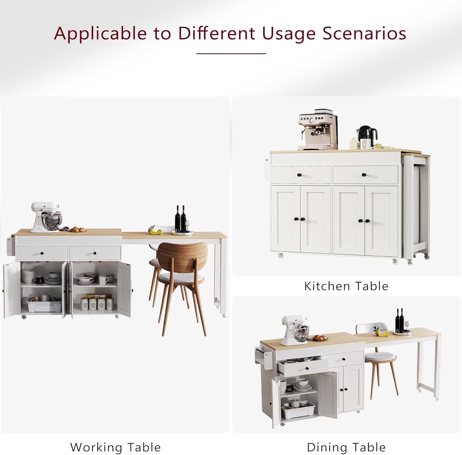 Crafted with a sleek white finish, this kitchen island exudes a modern charm that complements any dining room decor. The extendable dining table feature allows you to easily accommodate more guests for dinner parties or family gatherings.